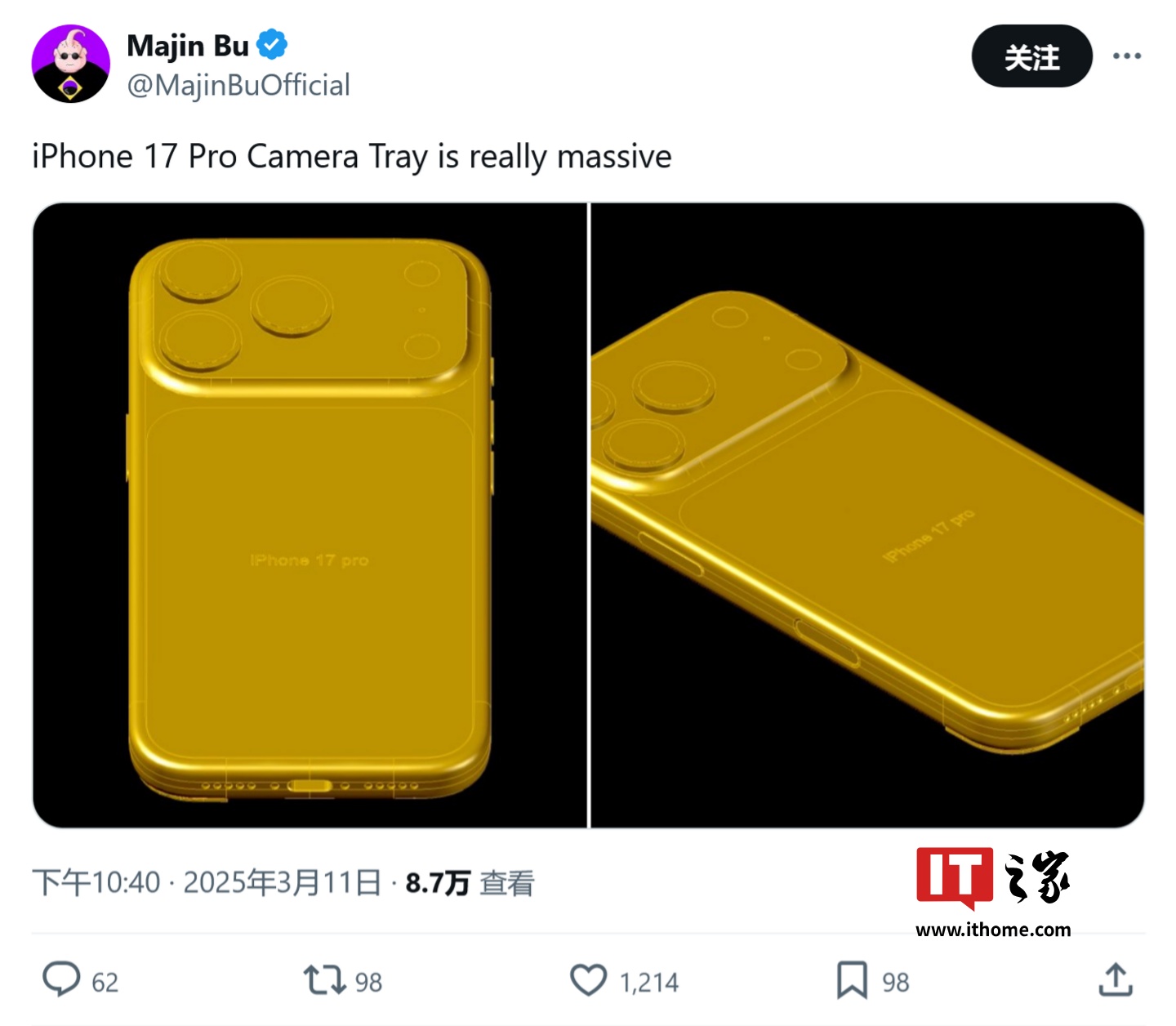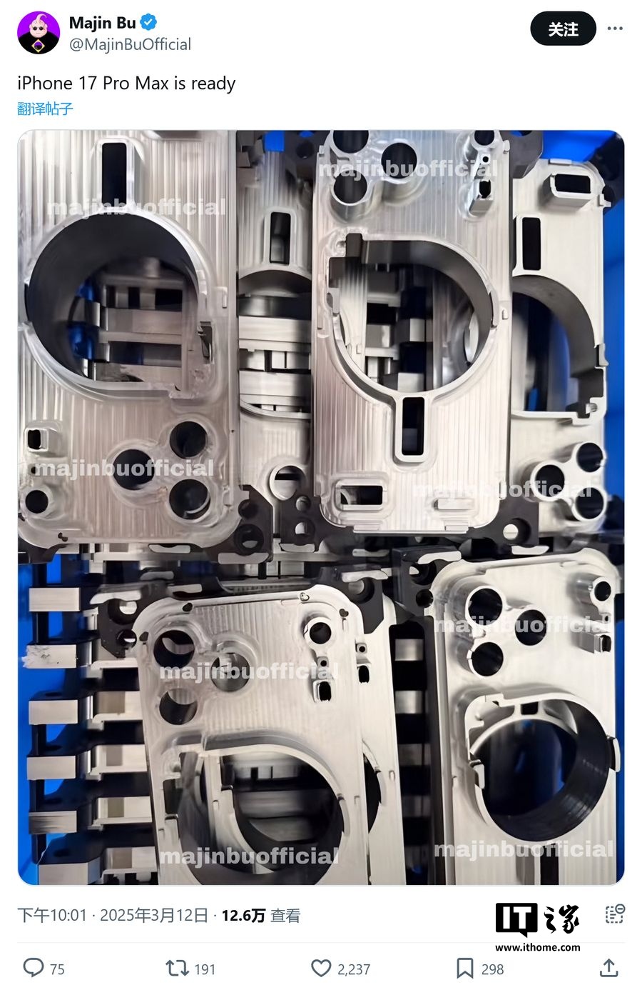 IT之家 3 月 13 日消息,消息源 @MajinBuOfficial 昨日(3 月 12 日)在 X 平台发布推文,分享了苹果 iPhone 17 Pro Max 的金属框架,从精密开孔来看,符合此前渲染图的横向大矩阵设计。