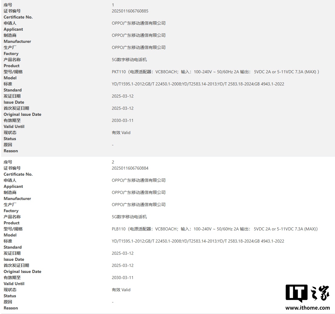 IT之家 3 月 13 日消息,昨日有两款 OPPO 新机通过了国家 3C 质量认证,型号分别为 PKT110、PLB110,均支持 80W 有线充电。