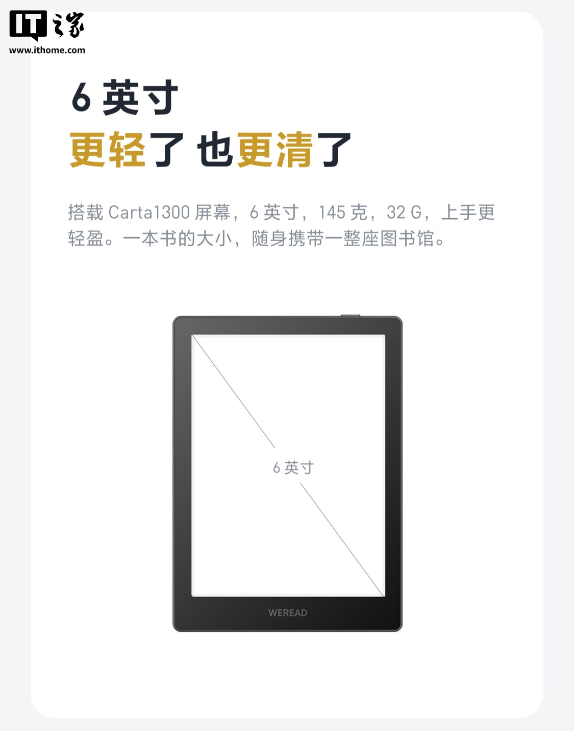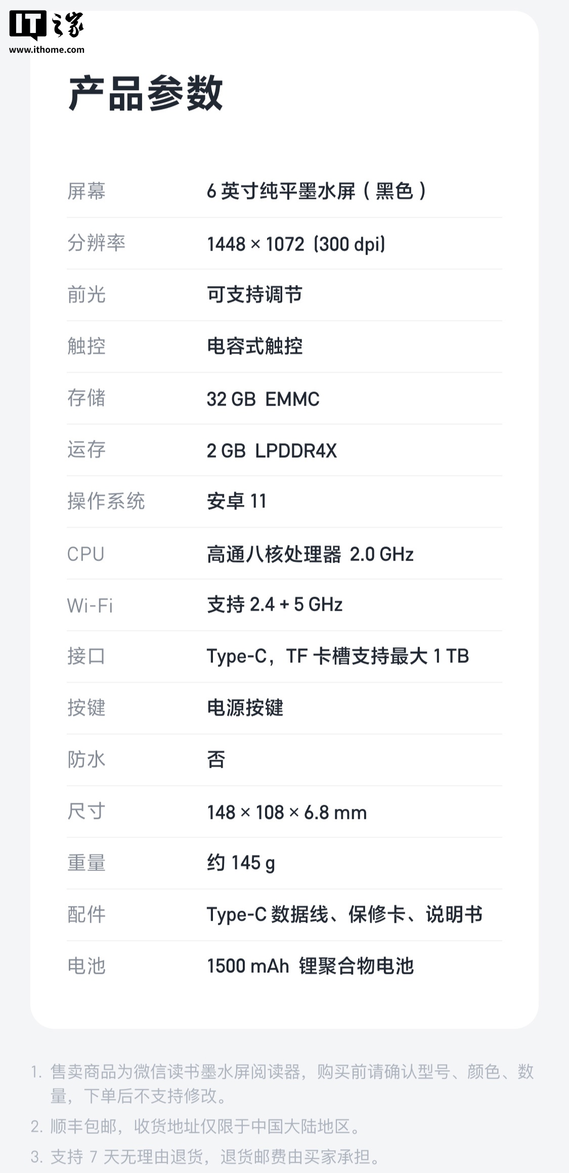 IT之家附第三代微信读书墨水屏阅读器产品参数如下: