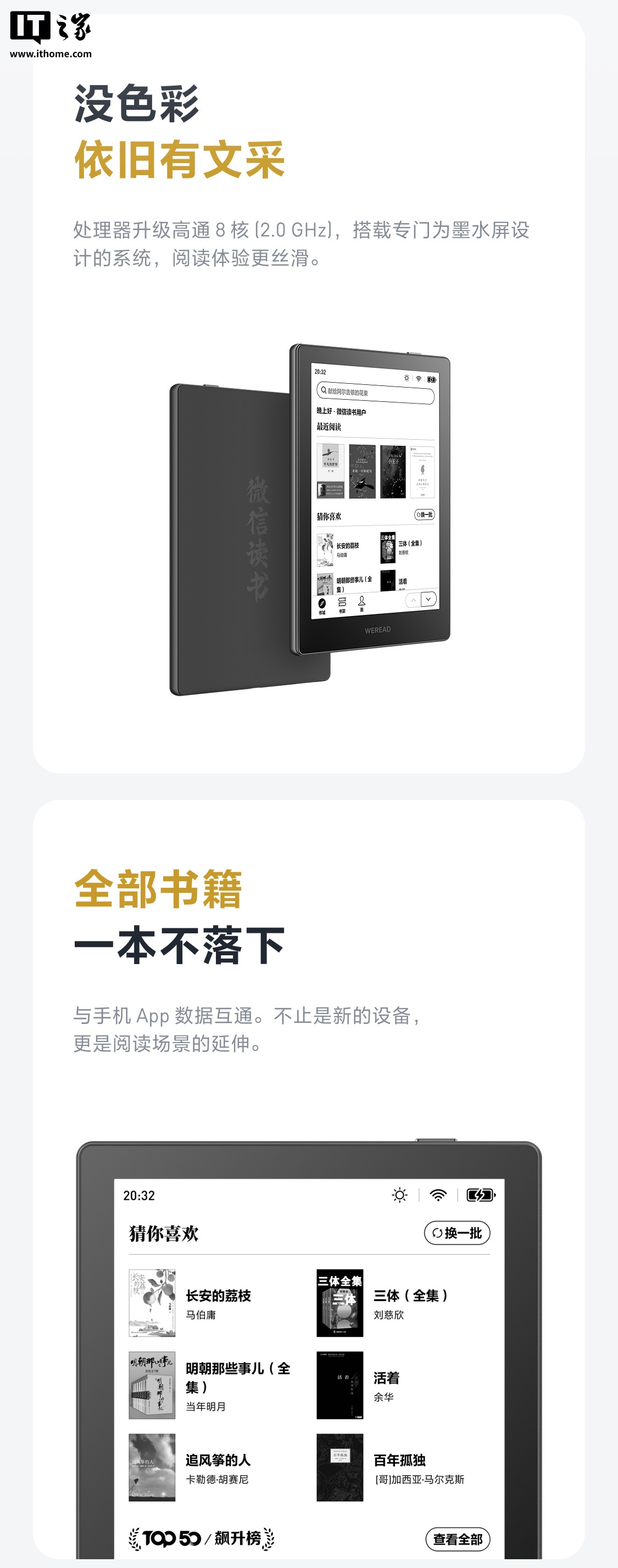 据介绍,微信读书墨水屏阅读器处理器升级高通 8 核(2.0 GHz),搭载专门为墨水屏设计的系统,支持与手机 App 数据互通。