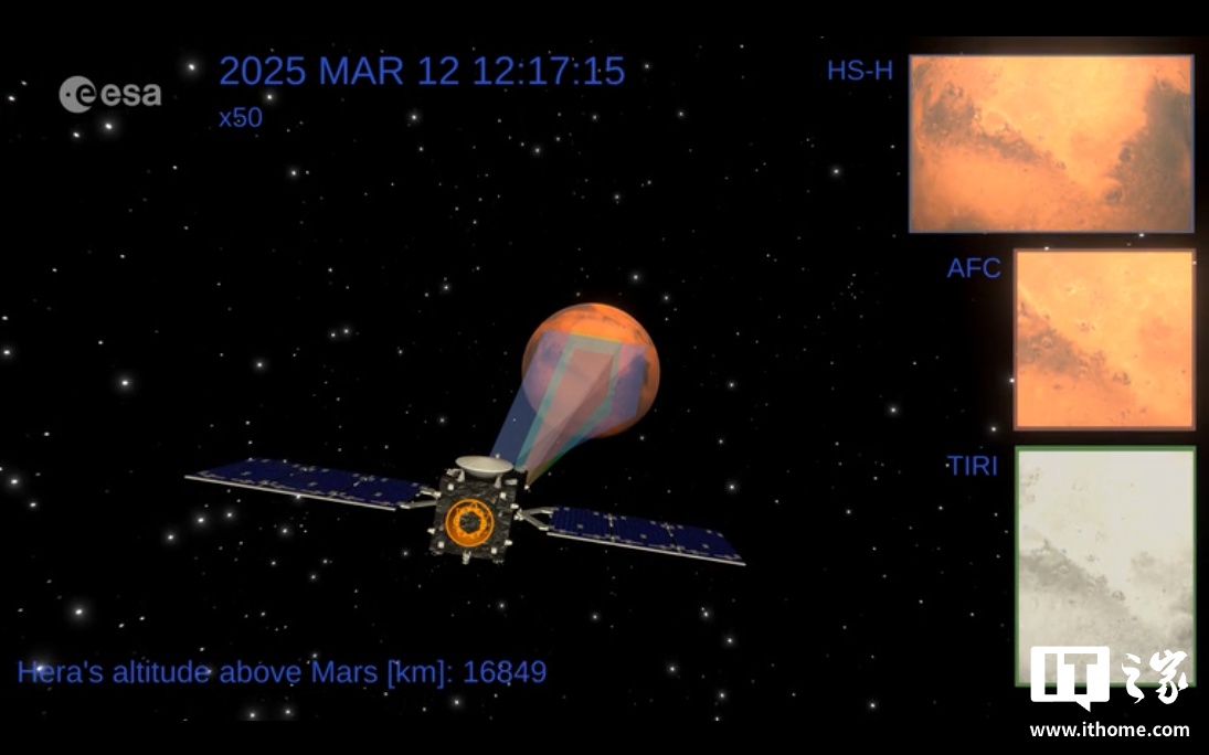 IT之家 3 月 13 日消息,3 月 12 日,欧洲航天局(ESA)的“赫拉”号(Hera)探测器在其行星防御任务中成功完成了一次火星飞越。借助火星的引力,探测器的轨道被调整,使其朝着迪迪莫斯(Didymos)双小行星系统前进。这一轨道修正不仅将探测器的旅程缩短了数月,还节省了大量燃料。