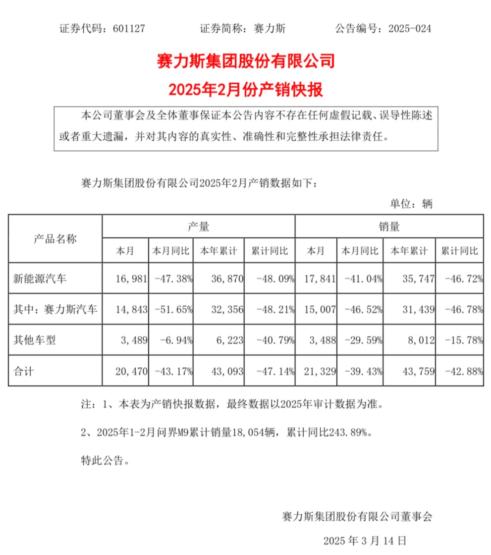 IT之家 3 月 13 日消息,赛力斯集团今日发布 2025 年 2 月份产销快报,2 月汽车合计销量 21,329 辆,同比下降 39.43%。