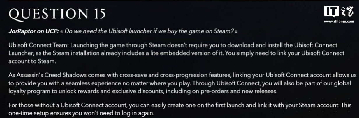 育碧表示,《刺客信条:影》的 Steam 版已经包含了 Ubisoft Connect 启动器轻量级嵌入版本,玩家只需将 Ubisoft Connect 账户绑定到 Steam 即可。