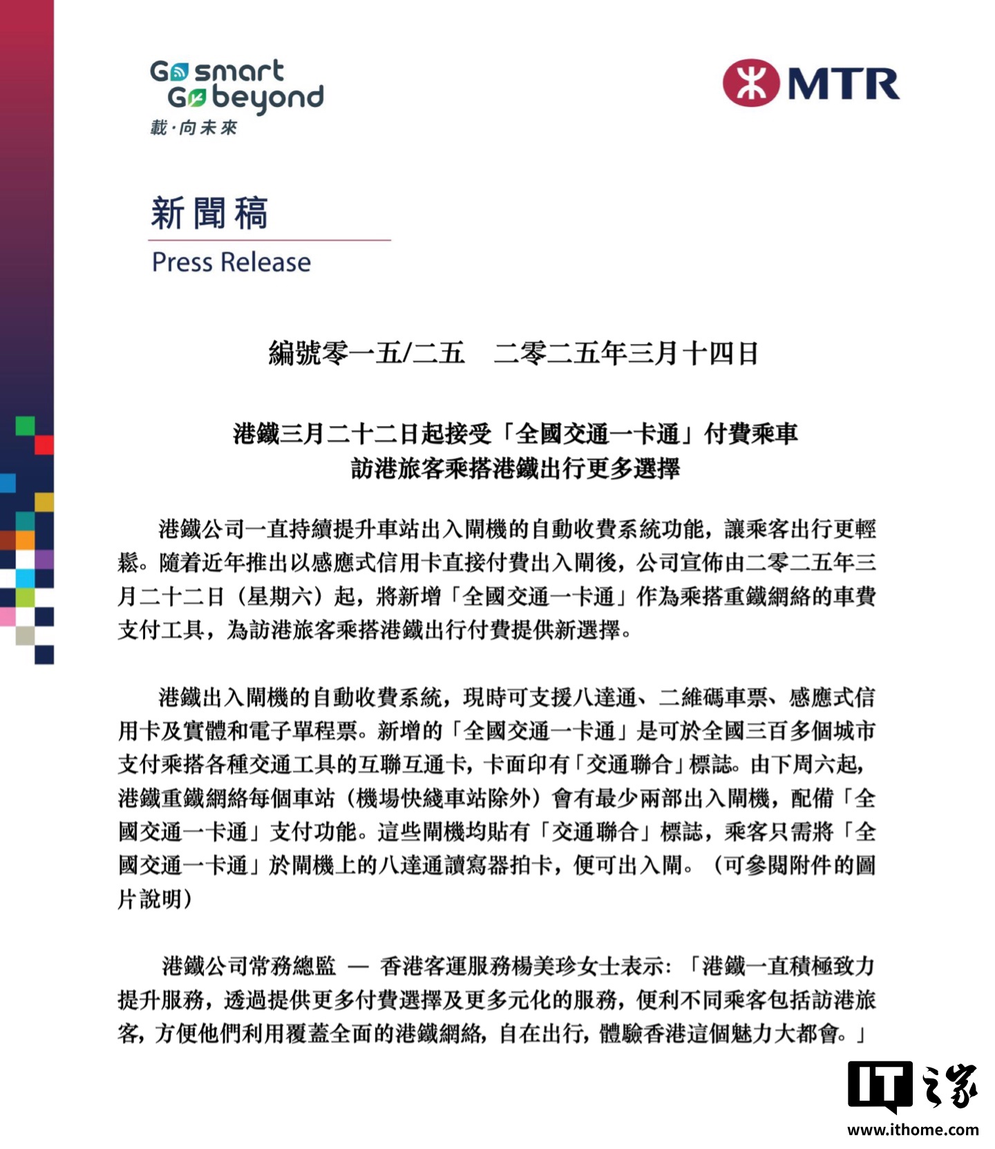 IT之家 3 月 14 日消息,据港铁 MTR 官网,香港港铁(MTR)网络将从 3 月 22 日起支持全国交通一卡通互联互通卡乘车,用户持实体卡 / 绑定有相应卡片的手机即可通过指定闸机乘搭港铁(相应卡片余额不少于 50 元人民币,暂不支持机场快线、轻铁、港铁巴士、港铁接驳巴士、东铁线头等车厢)。