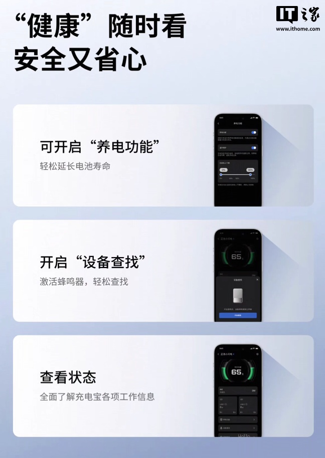同时,该充电宝搭载了一块智能屏显,可在显示实时功率、百分比电量和和可定制个性化图案之间切换。该充电宝的 App 拥有“养电功能”、“设备查找”和查看状态三大健康功能。