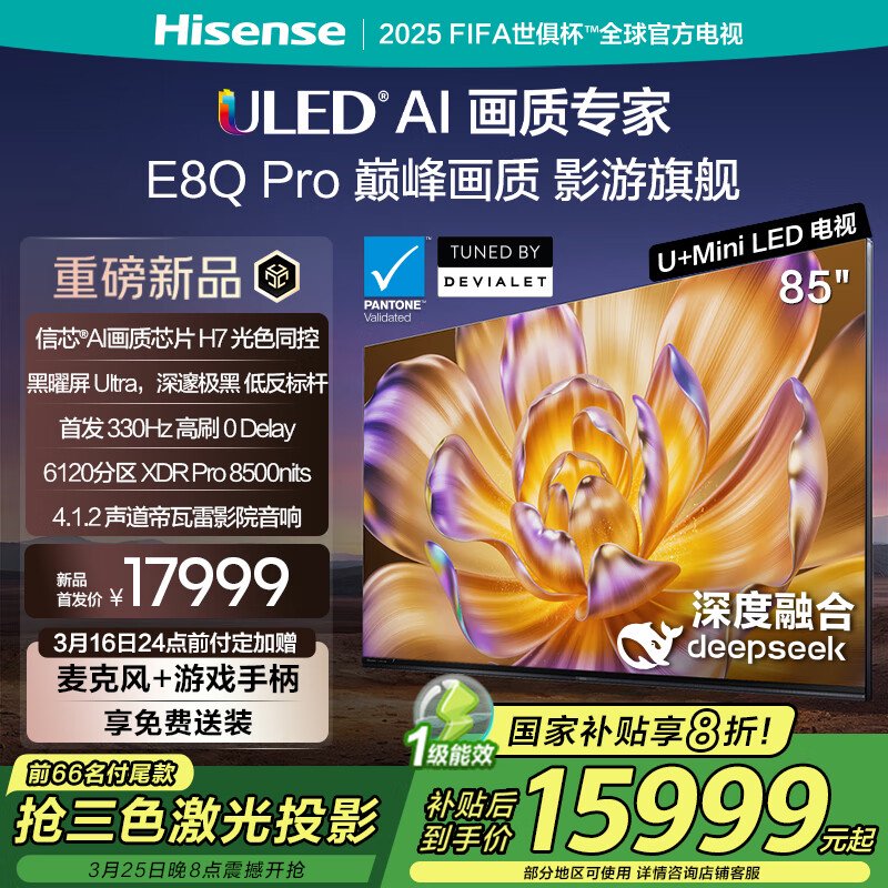 IT之家 3 月 14 日消息,3 月 9 日,海信正式推出了旗舰电视 E8Q 系列最新产品。此次发布的新品搭载了全球首颗信芯 AI 画质芯片 H7,配备了全新升级的黑曜屏 Ultra,支持 330Hz 系统级高刷,并引入了 U+Mini LED 光晕控制系统和影院级帝瓦雷声学系统等。