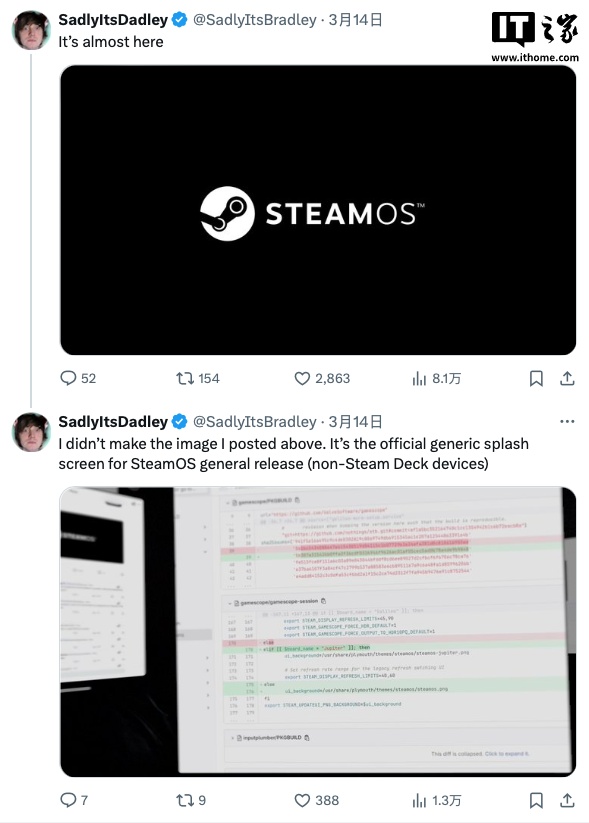 IT之家 3 月 15 日消息,根据 X 平台用户 SadlyItsDadley 透露,Valve 即将为 PC 完成 SteamOS 适配,让玩家获得像游戏机一样的以游戏为中心的操作系统,同时保持 PC 的强大可升级性。