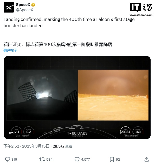 该枚一级助推器 B1081 完成第 13 次回收,系 SpaceX 猎鹰 9 号总计第 400 次火箭回收