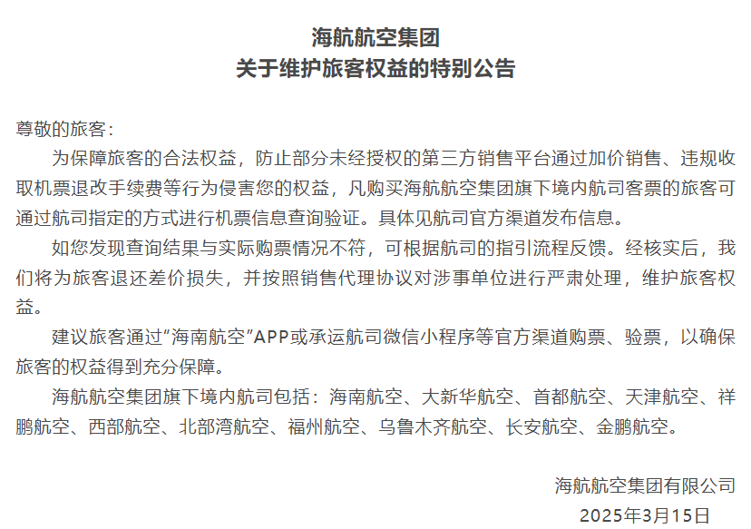 IT之家 3 月 15 日消息,海航航空集团有限公司今日发布关于维护旅客权益的特别公告,称用户发现查询结果与实际购票情况不符,可根据航司的指引流程反馈,核实后将为旅客退还差价损失,并按照销售代理协议对涉事单位进行处理。