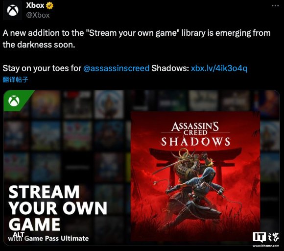 IT之家注意到,Xbox 并未说明《刺客信条:影》加入 Xbox 串流游戏库的具体日期,只是说明“很快将加入”。但《刺客信条:影》将于下周发布,希望在游戏发布后不久就能实现串流游玩。值得注意的是,Xbox 串流服务游戏库需要玩家先订阅 Xbox Game Pass Ultimate(Xbox 游戏通行证终极版),才能游玩已经购买的游戏。