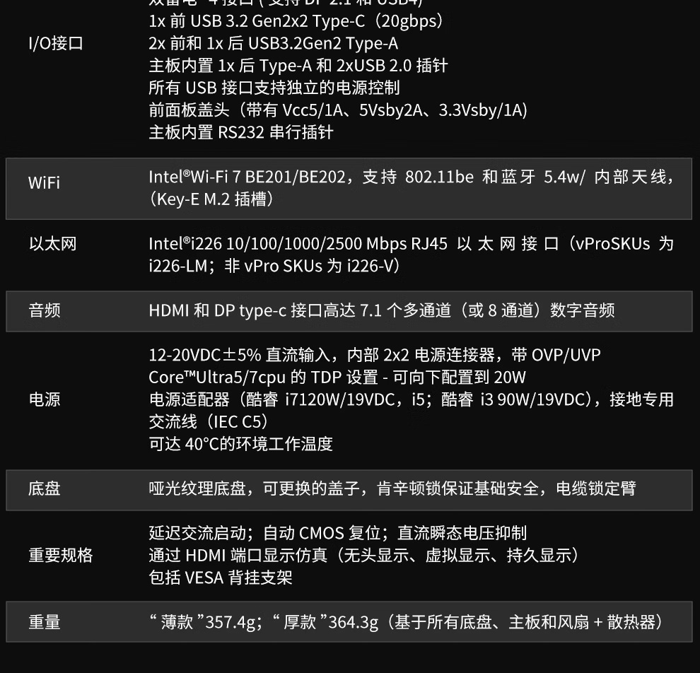 ▲ 厚薄款对比这款小主机仅有约 0.7L 的体积,采用快拆升级 2.0,采用双热管散热,可提供 64W 性能释放;支持电源同步(同步显示器和 NUC 主机的电源键)。