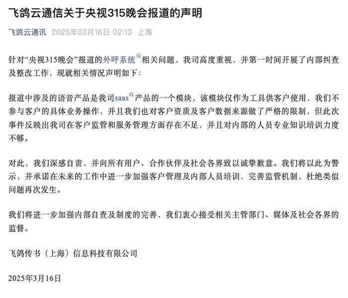 IT之家注意到,今日飞鸽云通信发布声明称,“央视 3・15 晚会”报道中涉及的语音产品是我司 saas 产品的一个模块,该模块仅作为工具供客户使用,我们不参与客户的具体业务操作,并且我们也对客户资质及客户数据来源做了严格的限制,但此次事件反映出我司在客户监管和服务管理方面存在不足,并且对内部的人员专业知识培训力度不够。对此,我们深感自责,并向所有用户、合作伙伴及社会各界致以诚挚歉意。