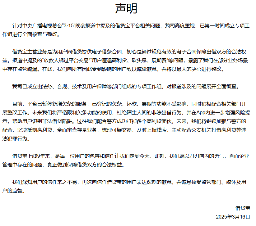 针对中央广播电视总台“3・15”晚会报道中提及的借贷宝平台相关问题,我司高度重视,已第一时间成立专项工作组进行全面核查与整改。