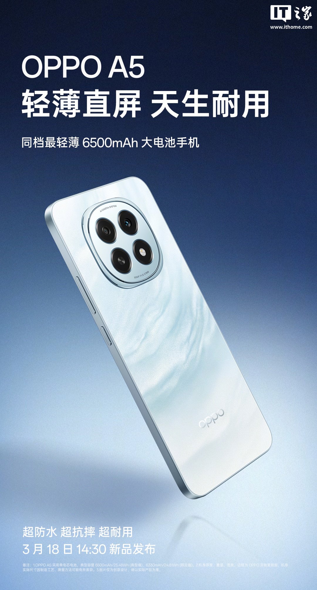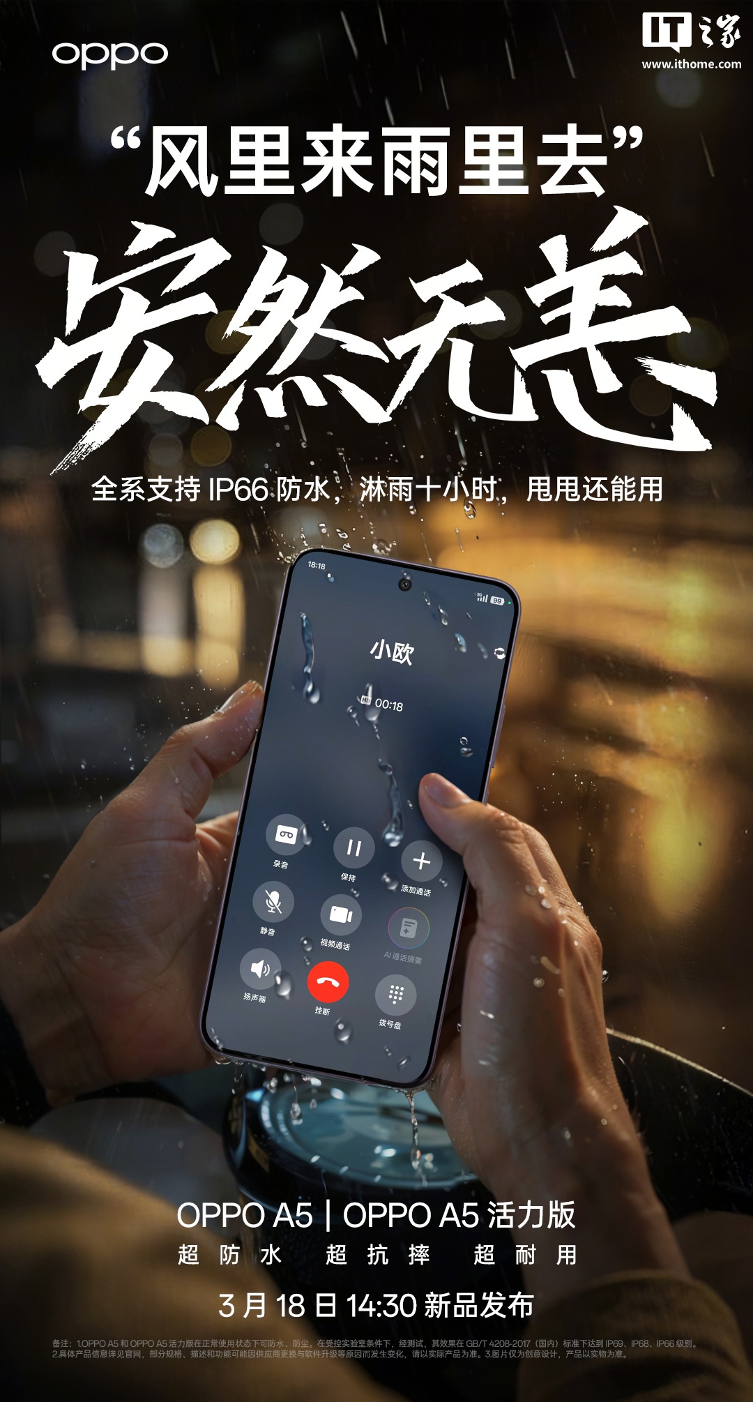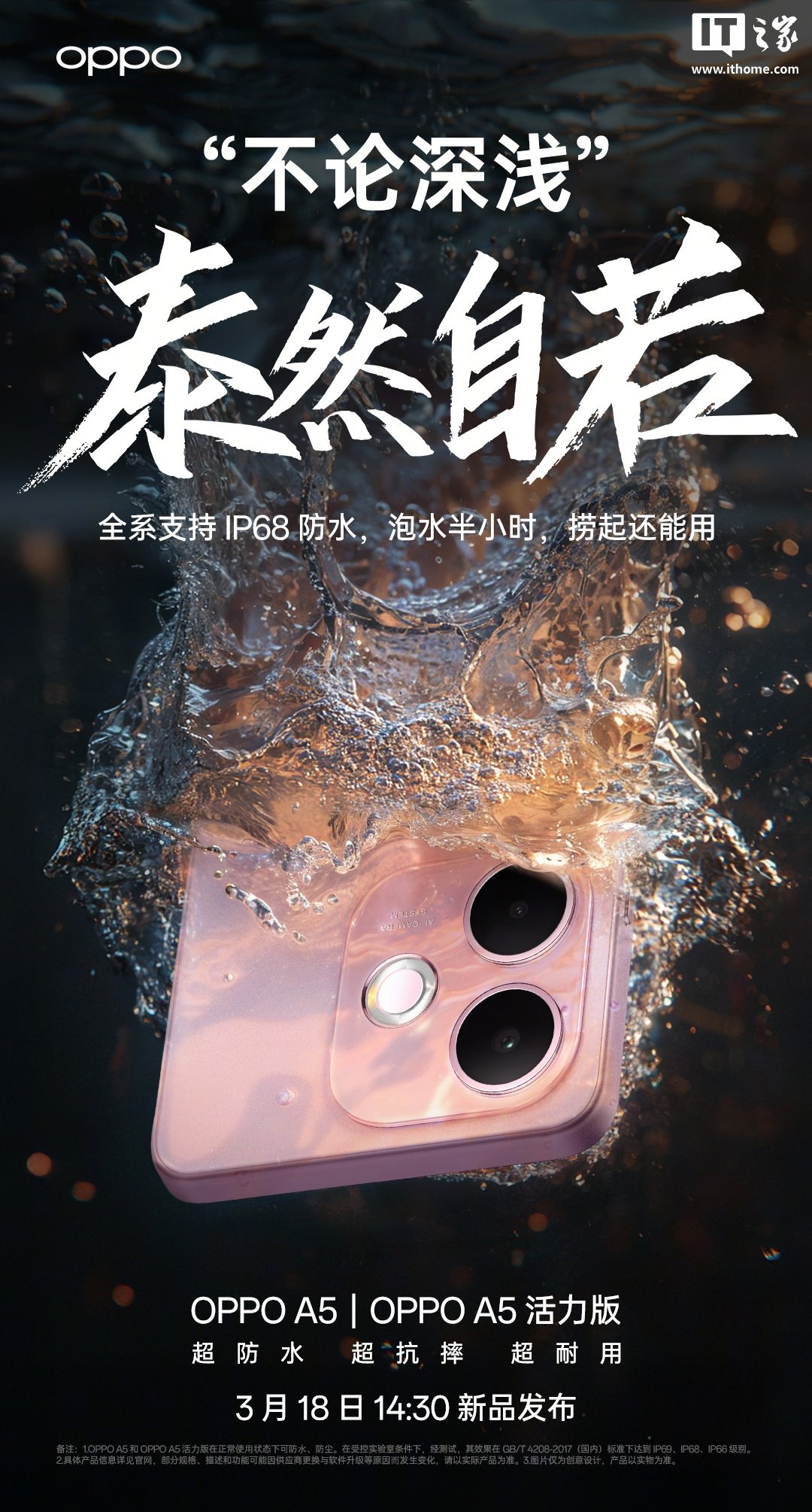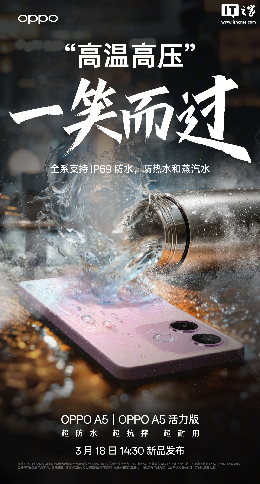 IT之家 3 月 16 日消息,OPPO A5 / A5 活力版手机将于 3 月 18 日 14:30 发布,新机全系通过 IP69、IP68、IP66 满级防水认证,宣称遭遇“泡水半小时、淋雨十小时”等场景还能用,可防热水和蒸汽水。