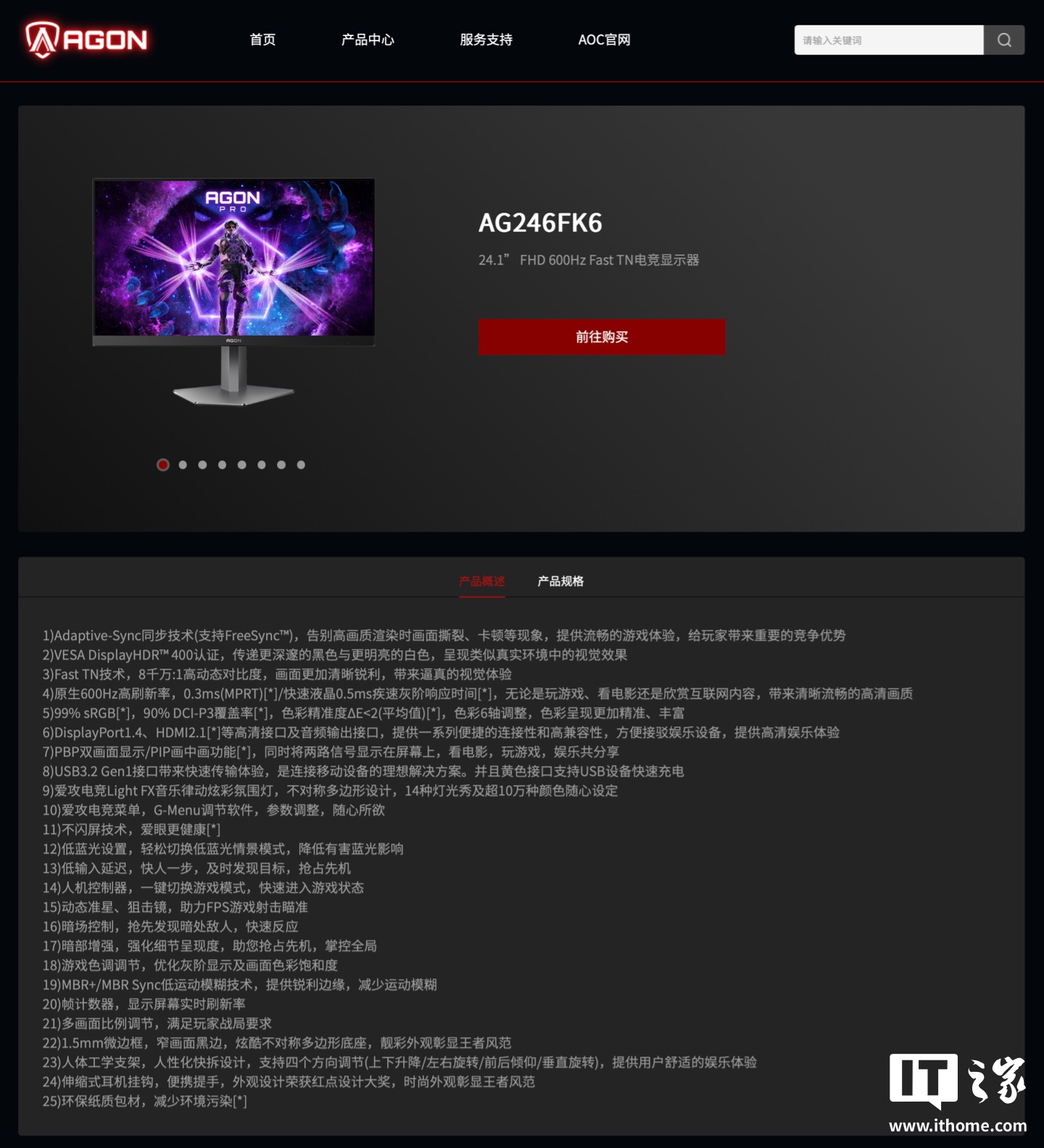 IT之家 3 月 16 日消息,继微星、卓威后,AOC 也宣布推出一款搭载 600Hz 面板的“AG246FK6”24.1 英寸 1080P 显示器,并透露该产品将在国内销售,不过价格方面暂未公布,国行官网的“前往购买”按钮实际上无法点击。