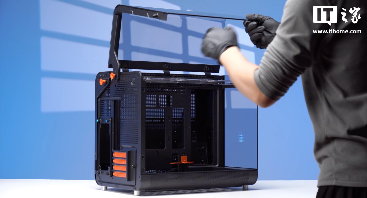 外观方面,该机箱号称从跑车汲取设计灵感,拥有“鸥翼双开门”设计,号称是“市场上首款超跑双开鸥翼门曲面机箱”,支持二档开合角度可调。同时机箱还配有悬浮风扇支架、玻璃铰链。