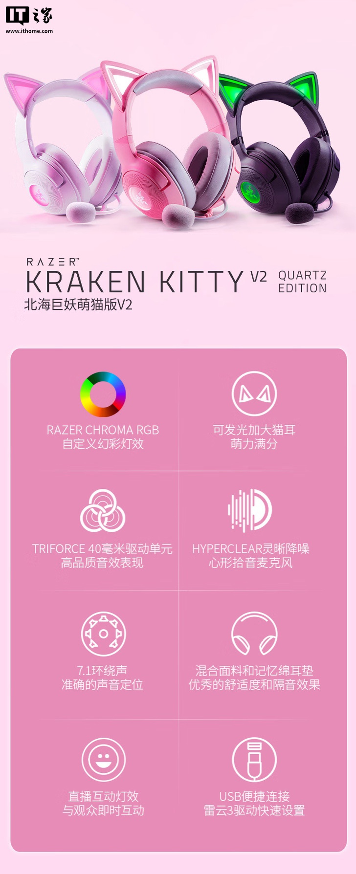 新款雷蛇北海巨妖萌猫版 V2 均配备较上代加大约 50% 的 RGB 幻彩猫耳,采用 40mm TriForce 驱动单元,耳垫为混合面料记忆棉材质。