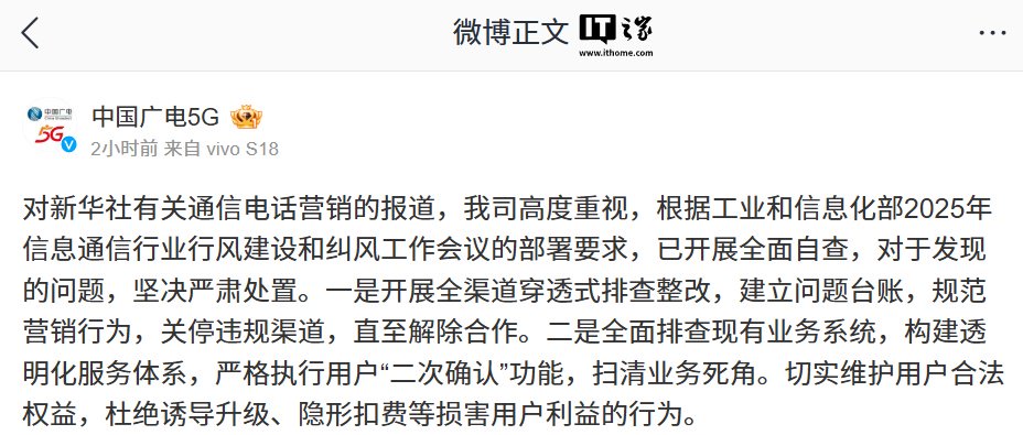对新华社有关通信电话营销的报道,我司高度重视,根据工业和信息化部 2025 年信息通信行业行风建设和纠风工作会议的部署要求,已开展全面自查,对于发现的问题,坚决严肃处置。一是开展全渠道穿透式排查整改,建立问题台账,规范营销行为,关停违规渠道,直至解除合作。二是全面排查现有业务系统,构建透明化服务体系,严格执行用户“二次确认”功能,扫清业务死角。切实维护用户合法权益,杜绝诱导升级、隐形扣费等损害用户利益的行为。