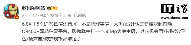 据爆料,这款新机采用 6.8X 1.5K LTPS 四窄边直屏设计,不是物理等窄,大 R 角设计也是新旗舰超前瞻。该机搭载天玑 9400 + 双芯独显平台,影像主打一个 50Mp 大底主摄,其它机身用料 / 指纹 / 马达 / 扬声器 / 防护规格都堆足。