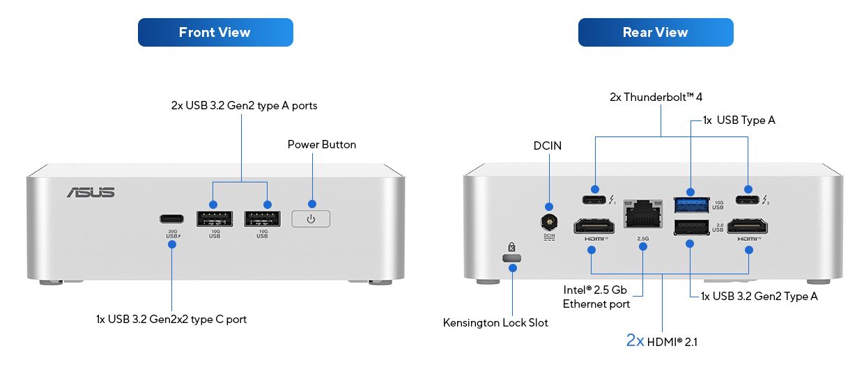 背部接口:1× 安全锁扣、1× DC-in、2× 雷电 4、2× HDMI 2.1 TMDS、1× 2.5GbE RJ45、1× USB-A 10Gbps、1× USB-A 480Mbps。