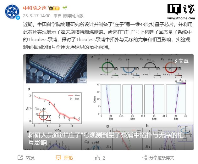 该团队自主设计并制备了“庄子”号一维 43 比特量子芯片,并利用此芯片实现展示了霍夫施塔特蝴蝶能谱。科研人员在“庄子”号上构建了固态量子系统中的 Thouless 泵浦,探讨了 Thouless 泵浦中拓扑与无序的竞争和相互影响,实验观测到准周期相互作用无序诱导的拓扑泵浦。