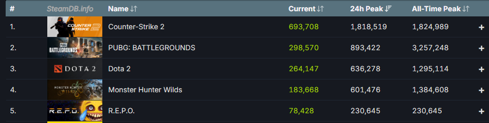 过去 24 小时内 Steam 上玩家最多的游戏排行榜: