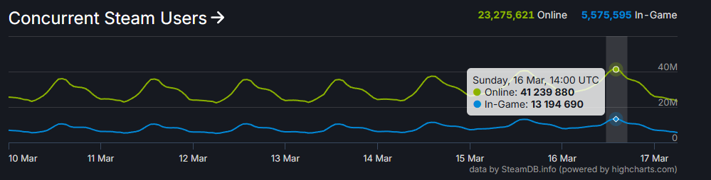 IT之家 3 月 17 日消息,据 SteamDB 数据显示,Steam 平台同时在线玩家人数在昨日突破 4100 万大关,再创历史新高。