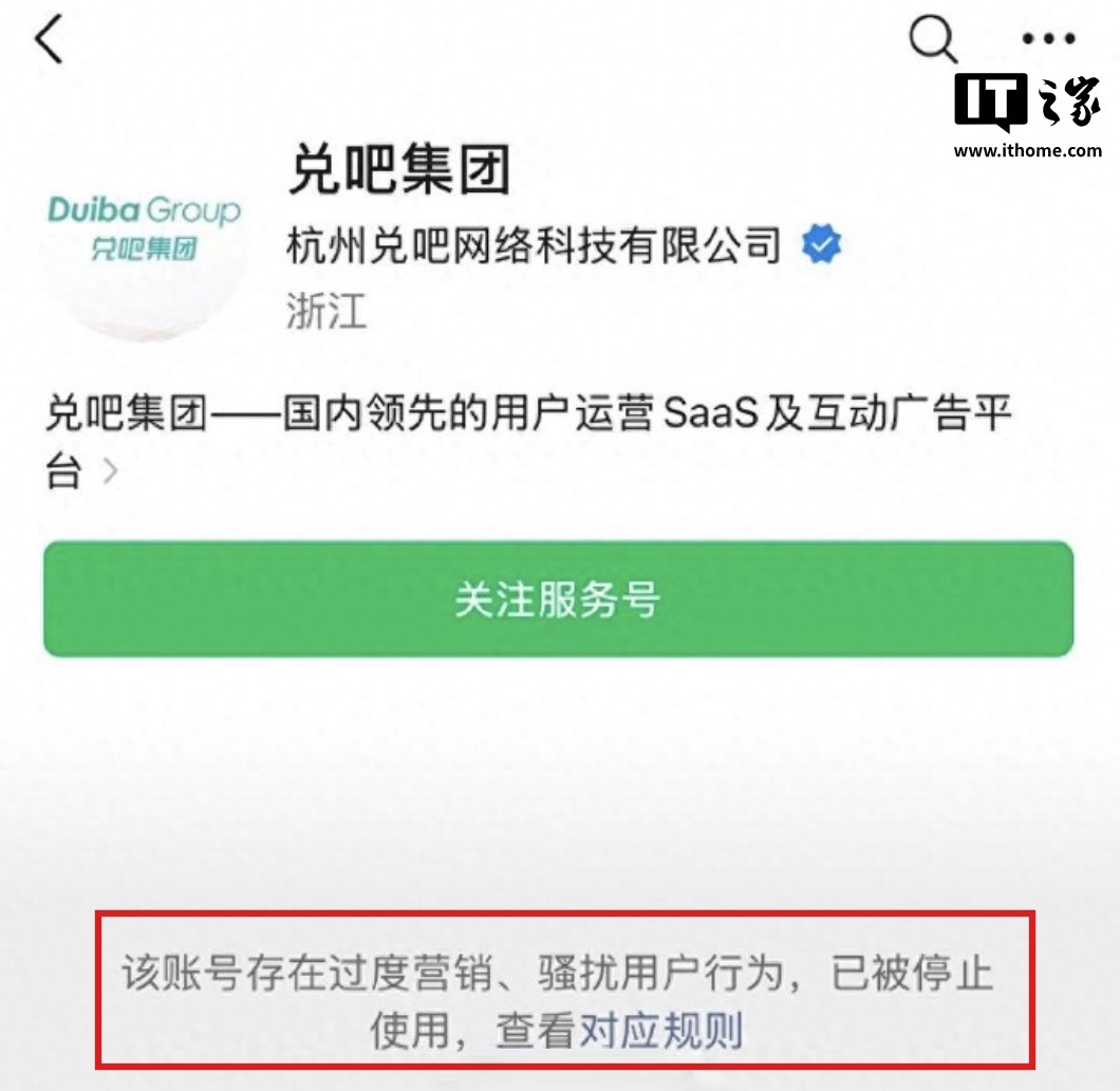 目前,微信平台显示“兑吧集团”官方微信公众号已被停止使用,停用理由为“该账号存在过度营销、骚扰用户行为,已被停止使用”,截至IT之家发稿,相应公众号已无法搜索到。
