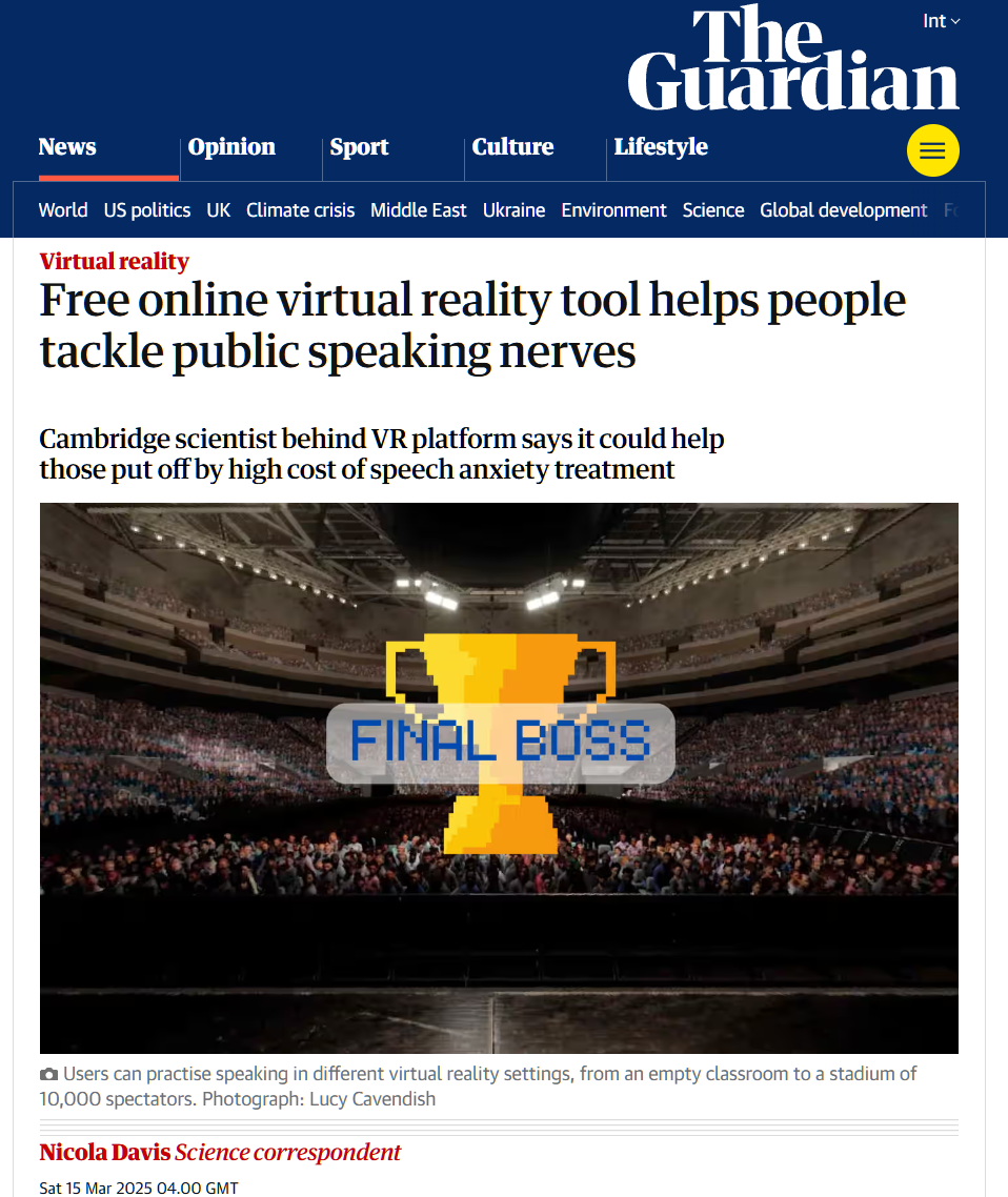 麦克唐纳在《虚拟现实前沿》期刊发表的一项研究表明,该平台可能确实有效。实验中,29 名中国青少年经过 30 分钟的 VR 训练和呼吸练习后,向 34 名真人观众用英语发表了 1 分钟演讲。