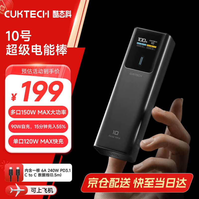作为比较,IT之家获悉标准版酷态科 10 号电能棒配备 10000 毫安时电芯,日常售价为 199 元,该产品提供一个单口最大输出功率为 120W 的 USB-C 接口,以及一个输出功率为 33W 的 USB-A 接口,输入方面支持 90W PD 快充。