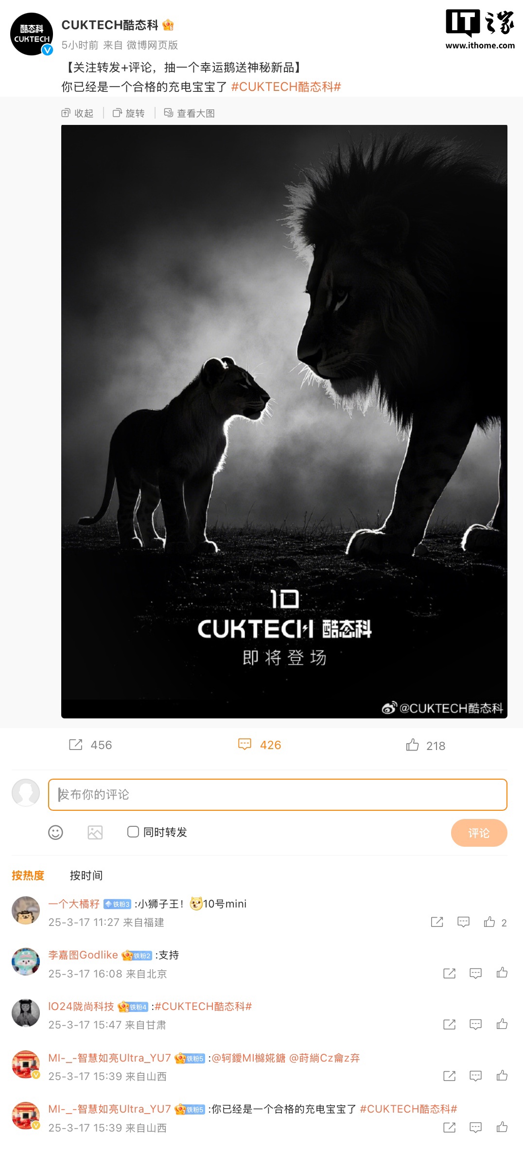 IT之家 3 月 17 日消息,CUKTECH 酷态科在微博发文,透露该公司将推出一款移动电源新品,综合官方海报及评论区,这款新品有望为 mini 版本的酷态科 10 号电能棒。不过目前关于这款新品的具体外形、定价等各种信息暂不知悉。