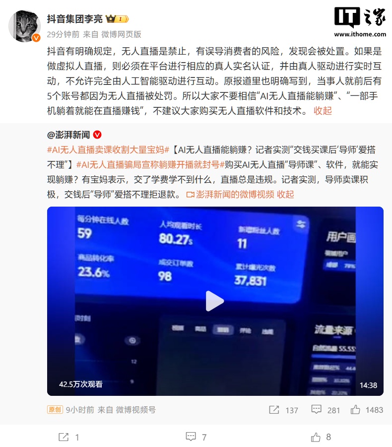 针对此事,抖音集团副总裁李亮在微博上表示,抖音明确规定禁止无人直播,有误导消费者的风险,发现会被处置。如果是做虚拟人直播,则必须在平台进行相应的真人实名认证,并由真人驱动进行实时互动,不允许完全由人工智能驱动进行互动。