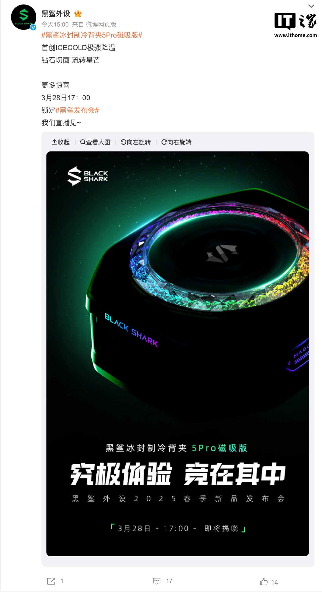IT之家 3 月 17 日消息,黑鲨今天预热即将在 3 月 28 日发布的黑鲨冰封制冷背夹 5 Pro 磁吸版散热器,该散热器号称首创 ICECOLD 极骤降温、同时外观方面采用“钻石切面”工艺,带有 RGB 灯。