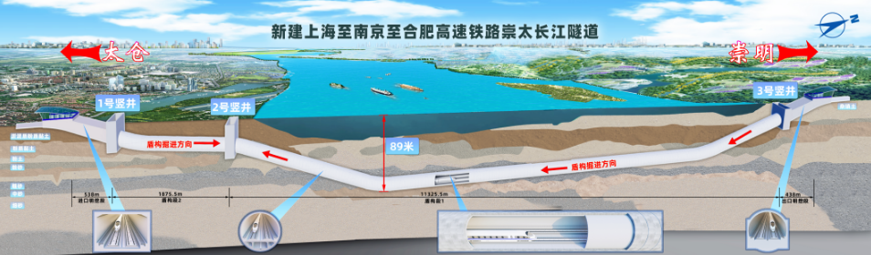 崇太长江隧道是上海至南京至合肥高铁控制性工程之一,连接上海市崇明区和江苏省太仓市,隧道全长 14.25 千米,其中盾构段长 13.2 千米,采取单洞双线设计,独头掘进 11.3255 千米,是全球独头掘进距离最长的隧道;设计时速 350 公里,为世界行车速度最高的水下隧道;隧道深入长江水下 89 米,是长江最深的江底隧道。