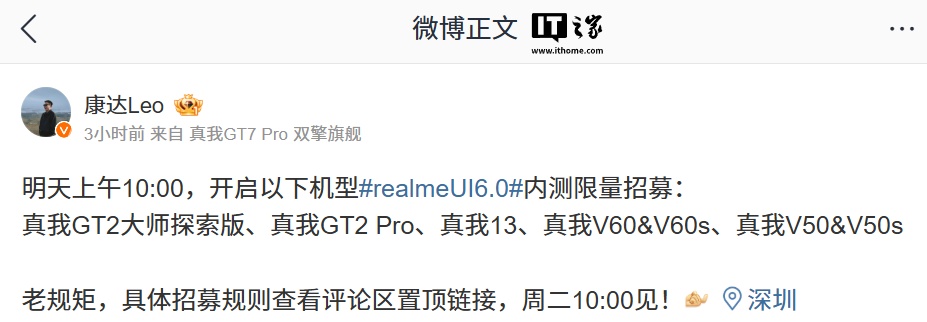IT之家 3 月 17 日消息,realme UI 产品经理 @康达Leo 今日发文称,真我 GT2 大师探索版、真我 GT2 Pro、真我 13、真我 V60 & V60s、真我 V50 & V50s 等 7 款机型将于明日上午 10 点开启内测限量招募。