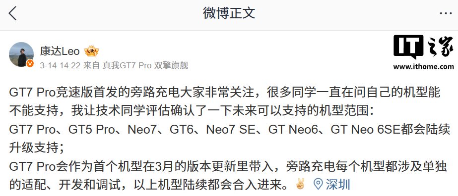 据IT之家昨日报道,realme UI 产品经理 @康达Leo 上周(3 月 14 日)发文称,GT7 Pro、GT5 Pro、Neo7、GT6、Neo7 SE、GT Neo6、GT Neo 6SE 都会陆续升级支持旁路充电。GT7 Pro 会作为首个机型在 3 月的版本更新里带入该功能。