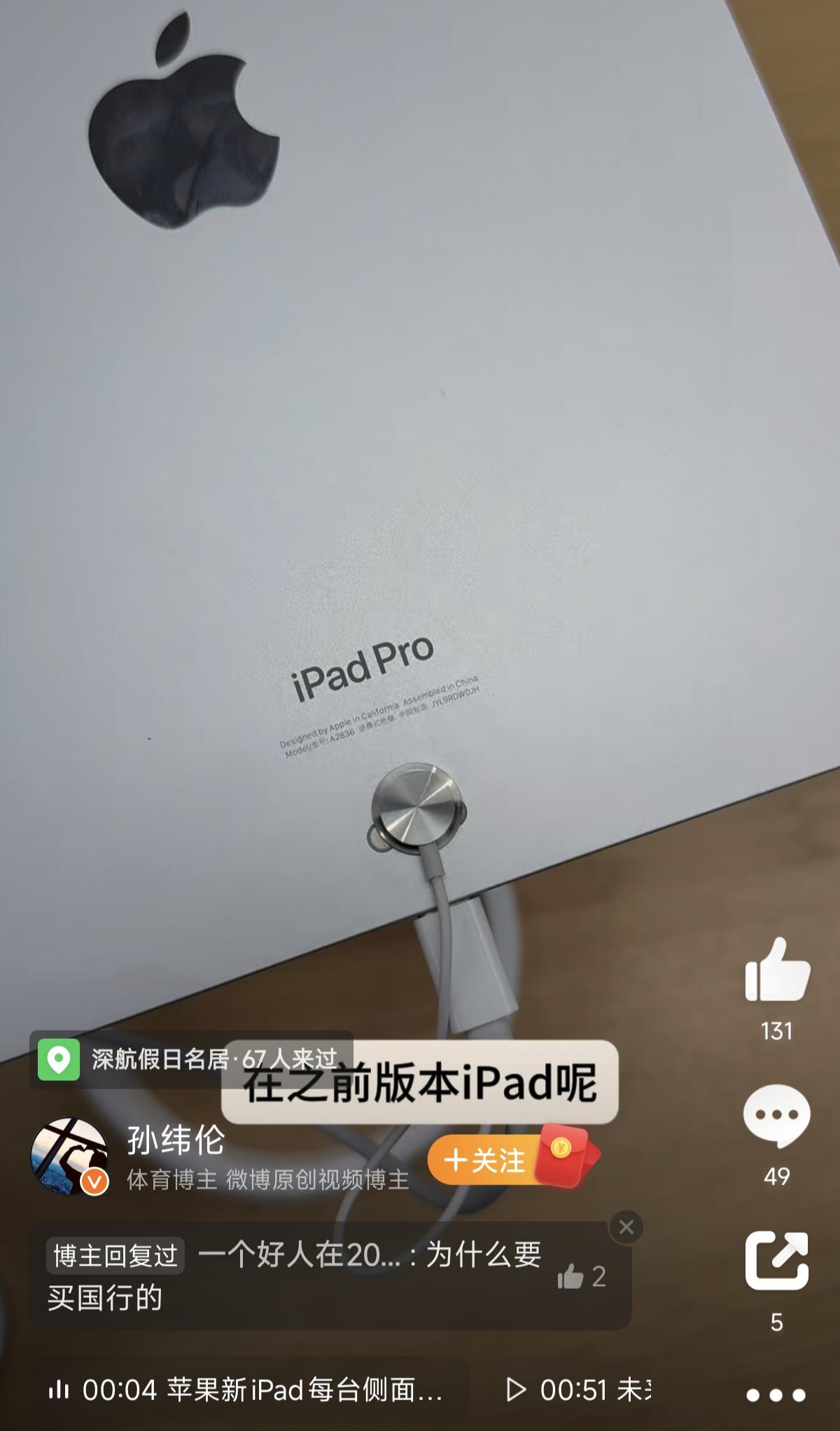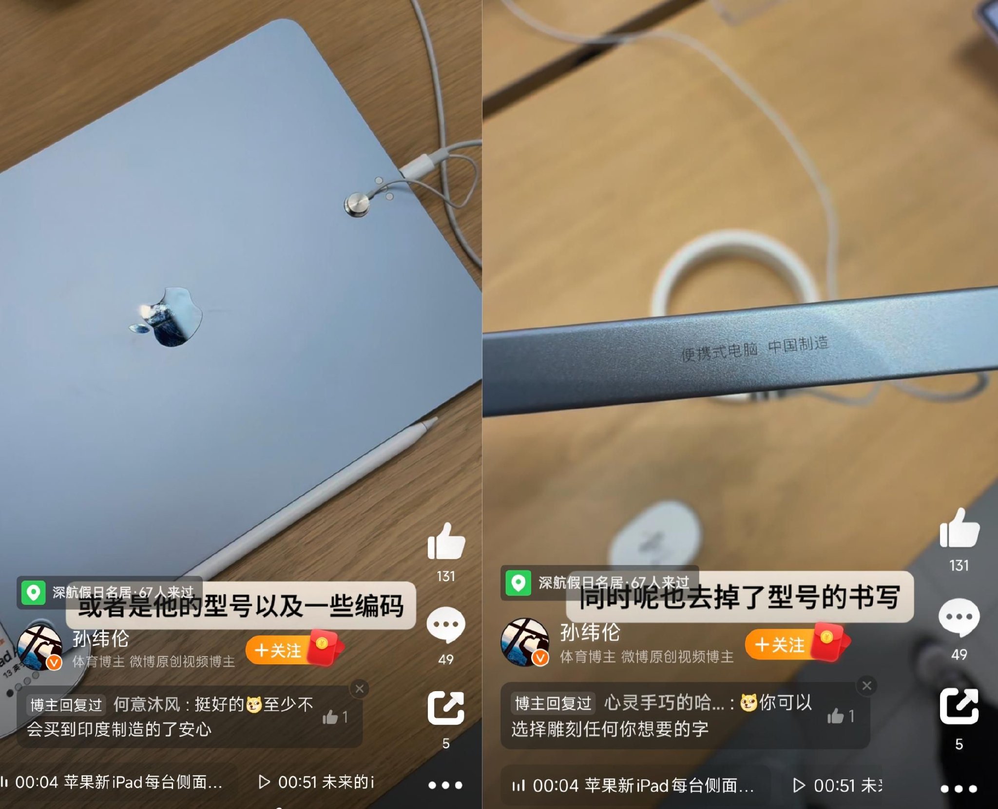 但根据该微博用户的实拍,国行的新款 iPad Air(M3)及 iPad(A16)中移除了该字样,但在设备的侧面边框上标注了“便携式电脑 中国制造”的字样。