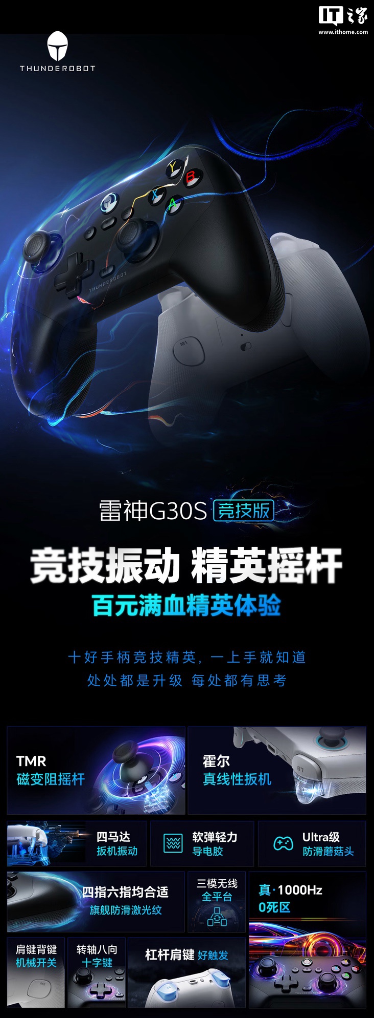 IT之家 3 月 17 日消息,雷神现已在京东上架 G30S 竞技版手柄,该手柄主打“TMR 磁变阻摇杆”、“真扳机震动”,定价为 109 元,将于 4 月 3 日首销。