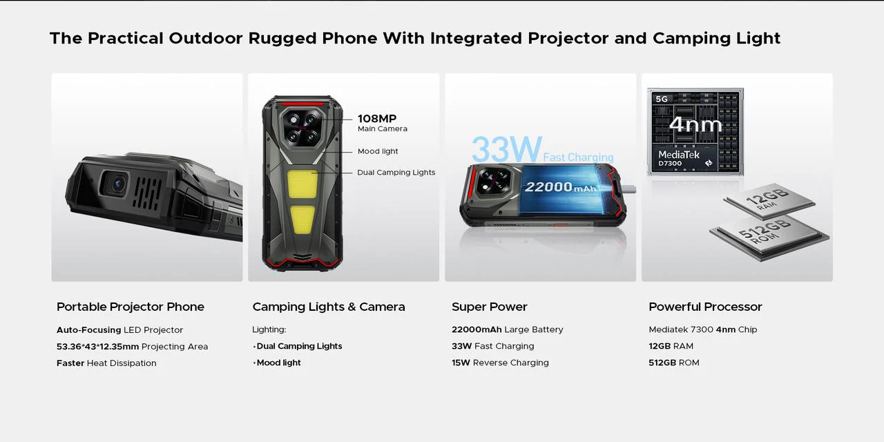 IT之家 3 月 17 日消息,来自中国的手机制造商 Doogee 本月发布了“坚固型”智能手机新品 V Max Play,官方称其内置便携投影仪、强力露营灯和超大 22000mAh 电池,是一款户外使用的多功能工具。