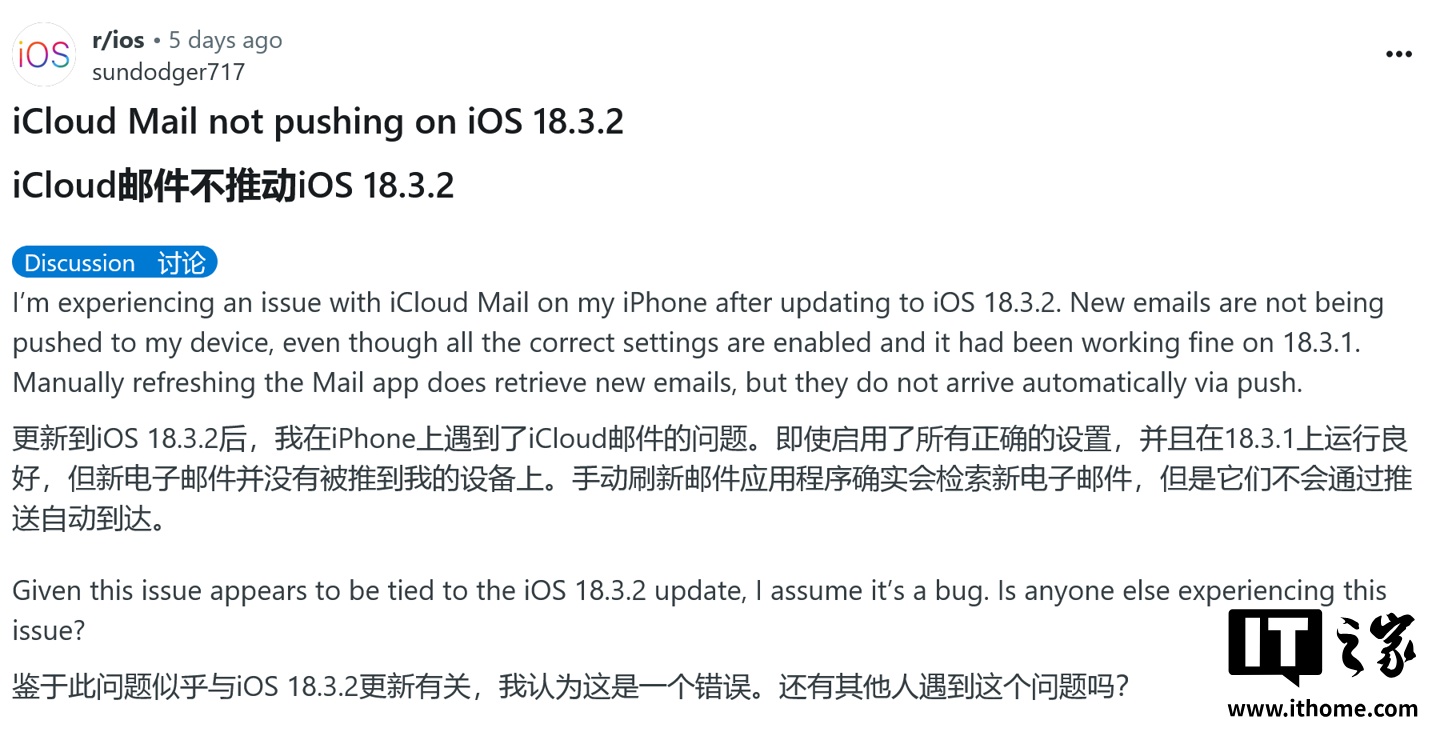 IT之家 3 月 18 日消息,科技媒体 MacRumors 昨日(3 月 17 日)发布博文,报道称部分 iPhone 用户反馈升级上周发布的 iOS 18.3.2 更新后,导致 iCloud 邮件推送功能失效。