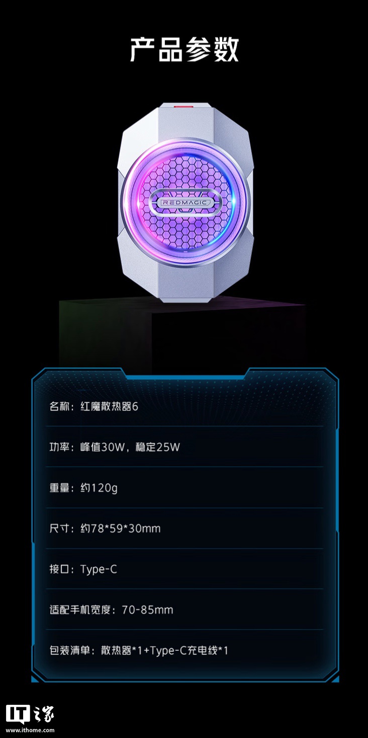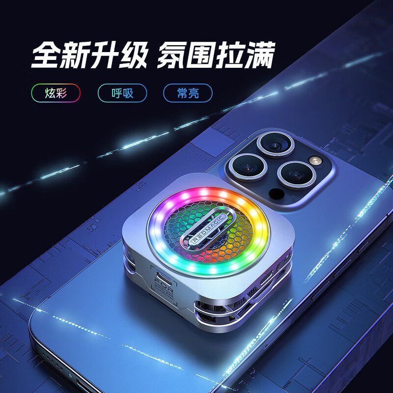 该散热器拥有 16 颗 RGB 灯珠,内置 14N 磁力磁铁,可以吸附在具有磁吸功能的手机上。散热器功率峰值 30W,配备 40x15mm 七叶风扇,内置高密度 TEC、3D 贯穿式立体石墨烯散热片、双层复合导电硅胶和 3D 贯穿立体风道,支持多种模式运行,至高可降温 41 度。