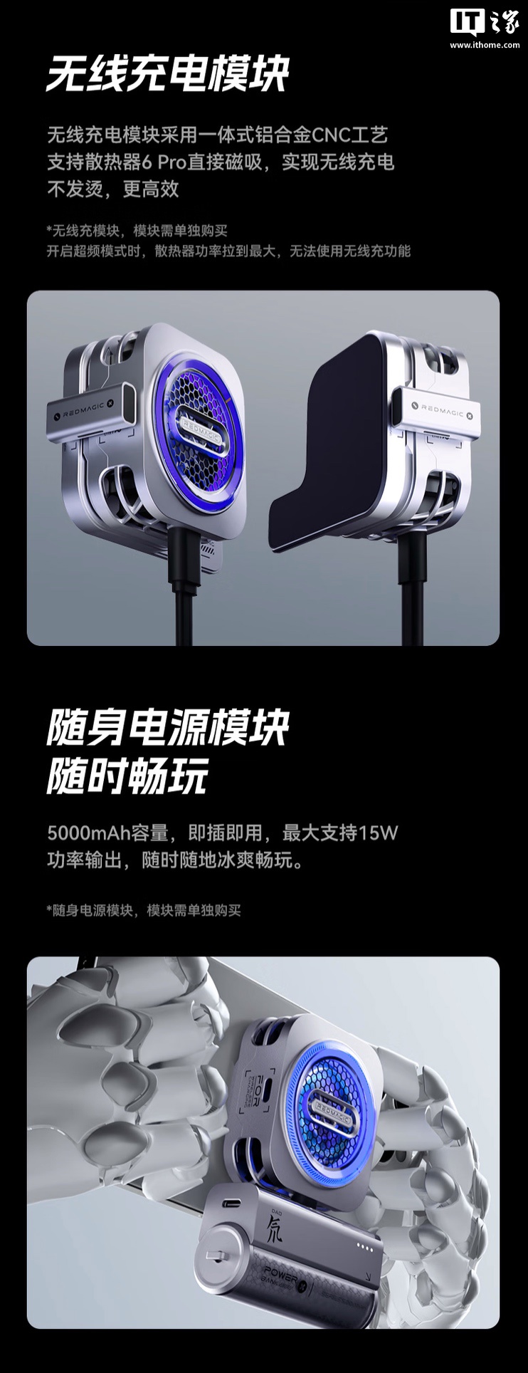 官方重点期强调该散热器采用的模块化设计,其可以选配“直播卡扣”模块安装在没有相应磁吸功能的设备上,并通过卡扣内置的 1/4 螺口将手机固定在三脚架进行直播,还能搭配定价 199 元的无线充电模块为设备进行 15W 无线充电。另有一款有线充电模块“随身电源模块”还未上架。
