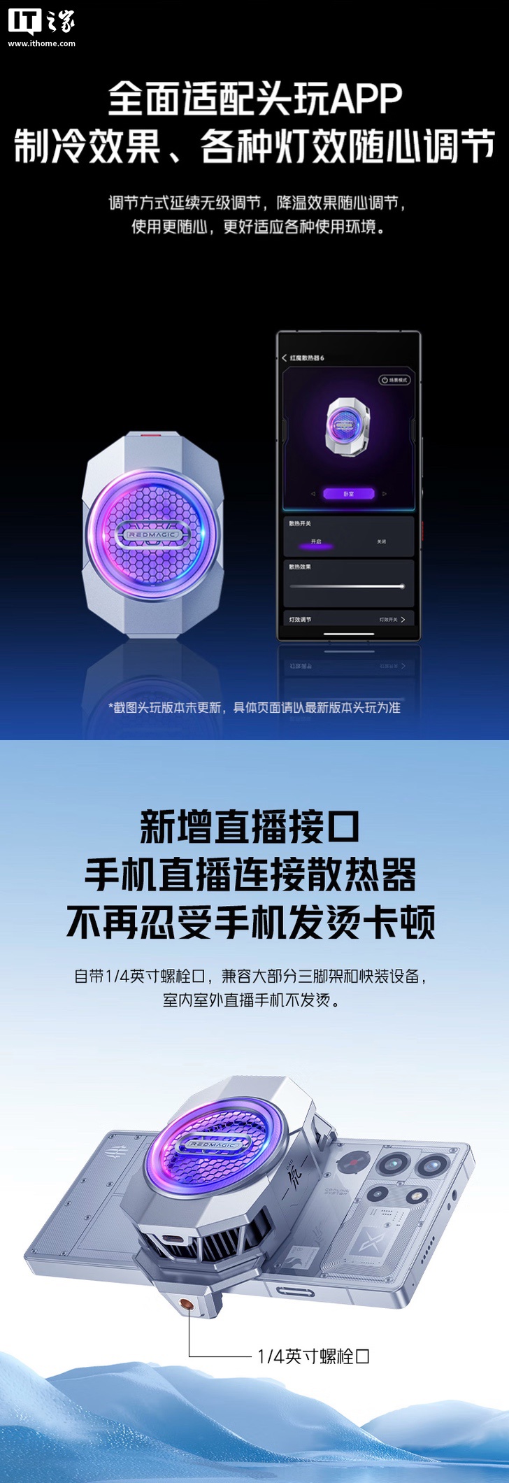 该散热器整体重量约 120 克,厚度为 30mm,配备的 RGB 灯支持使用 App 调光,同时带有 1/4 英寸螺纹口,可以将手机固定在三脚架上。