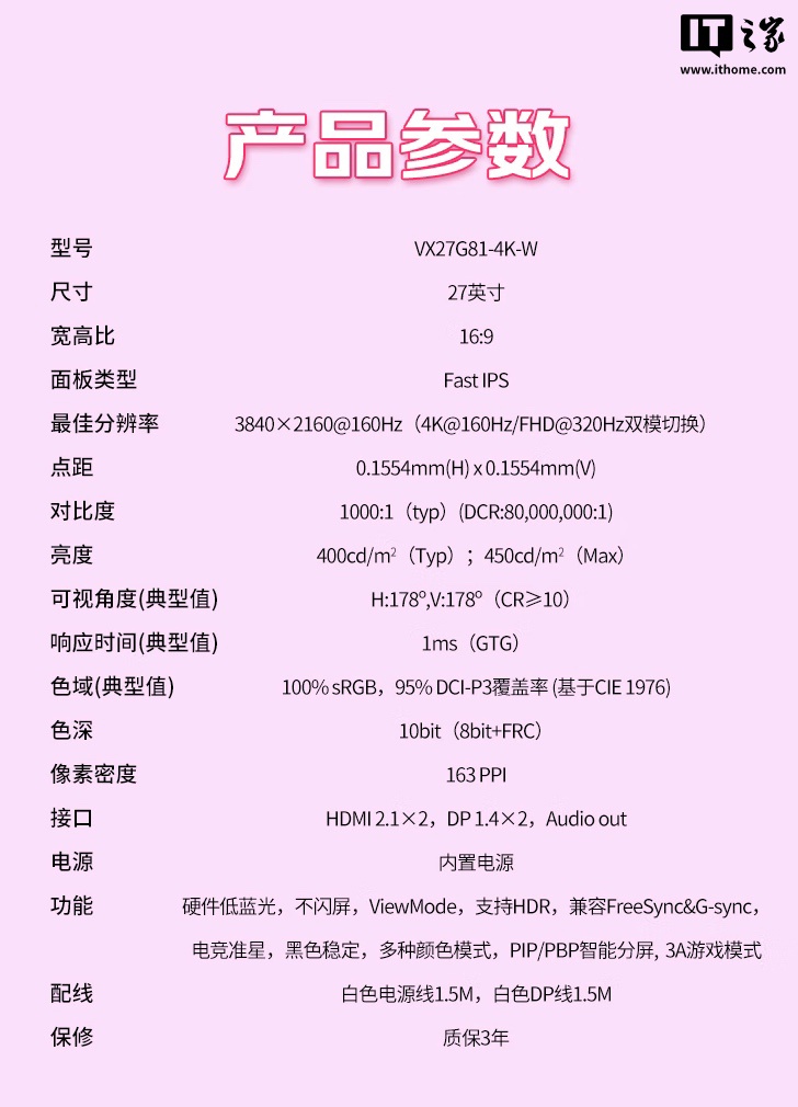 IT之家 3 月 18 日消息,优派旗下“VX27G81-4K-W”27 英寸显示器现已在京东开启首销,这款显示器主打“4K 160Hz / 1080P 320Hz 双模”,定价为 1699 元,国补后定价为 1445 元。