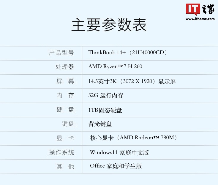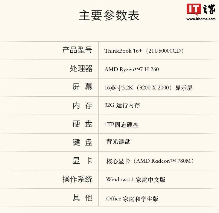 ▲ ThinkBook 16+IT之家附产品参数如下: