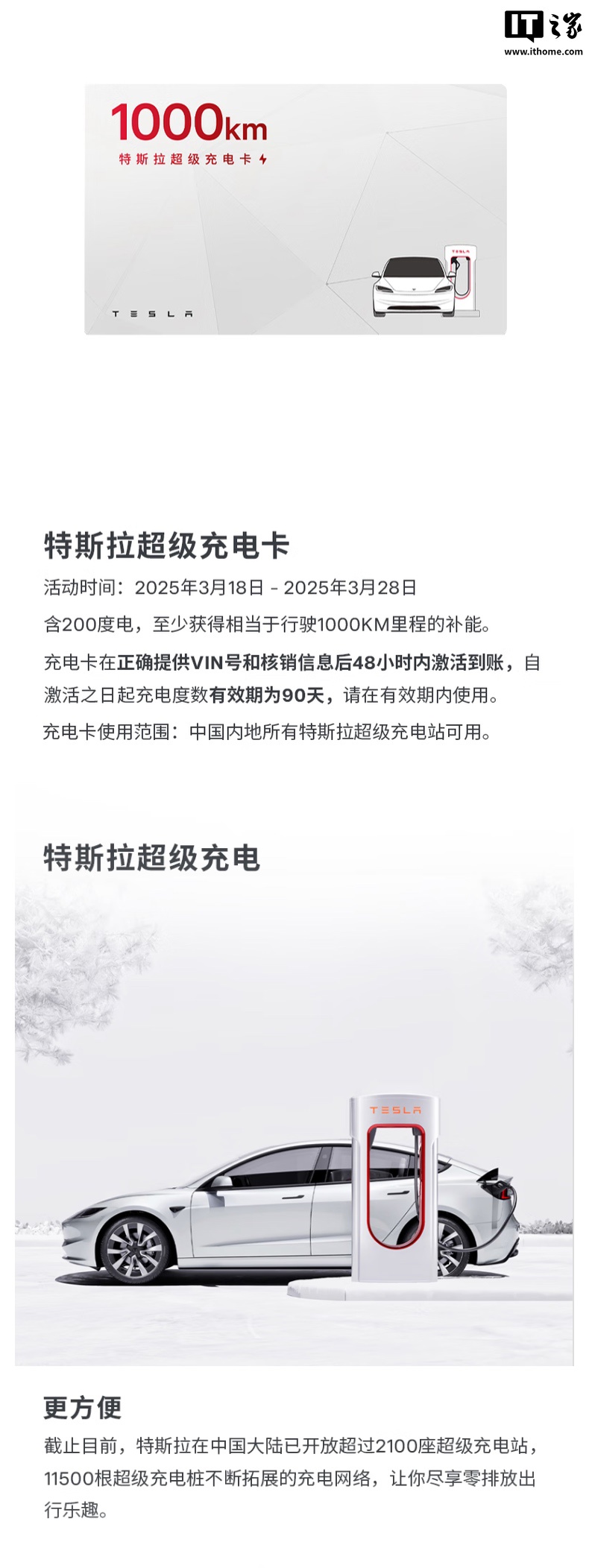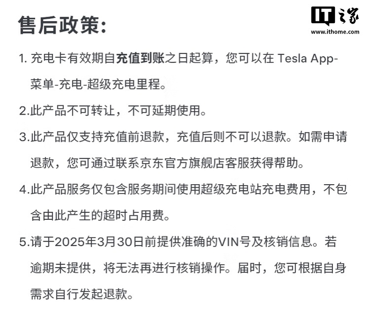 IT之家注意到,用户在购买相应充电卡后需要联系客服提供汽车的 VIN 号,相应充电卡将在 48 小时内激活到账,自激活之日起充电度数有效期为 90 天,充电卡绑定完成后不可修改,不可解绑,产品亦不可转让,不可延期使用,充电卡仅包含服务期间使用超级充电站充电费用,不包含由此产生的超时占用费。