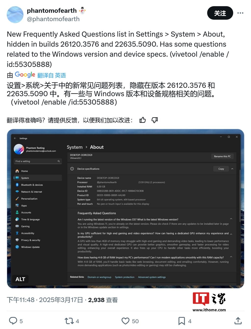 IT之家 3 月 19 日消息,消息源 @phantomofearth 于 3 月 17 日在 X 平台发布推文,曝料称在 Windows 11 Build 26120.3576 和 22635.5090 预览版中,微软新增了 FAQ 解答区域,帮助用户了解内存和显卡等组件对性能的影响。
