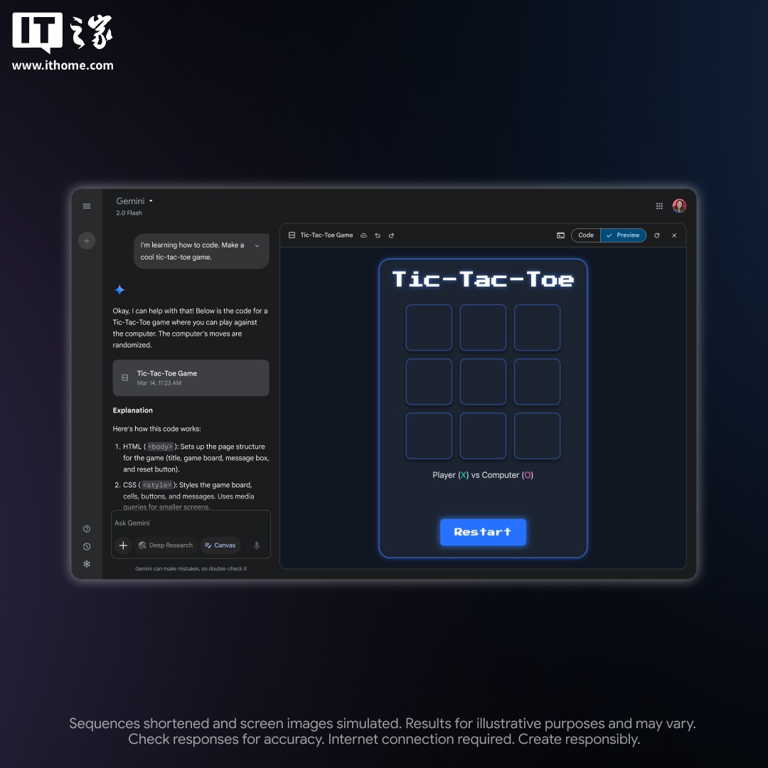 Canvas 还具备编程功能,包括一项允许用户生成和预览 HTML、React 代码以及其他 Web 应用程序原型的功能。用户可以要求 Gemini 对预览内容进行修改,Canvas 将会迭代刷新预览效果。西特伦在博客中写道:“例如,如果你想为你的网站创建一个电子邮件订阅表单,你可以要求 Gemini 生成表单的 HTML 代码,然后预览它在你的网络应用中的外观和功能。”