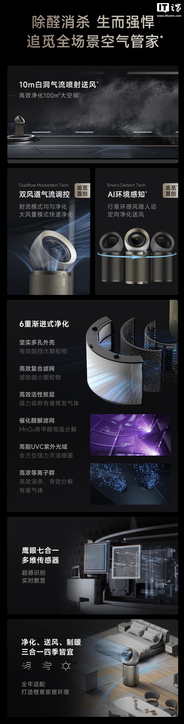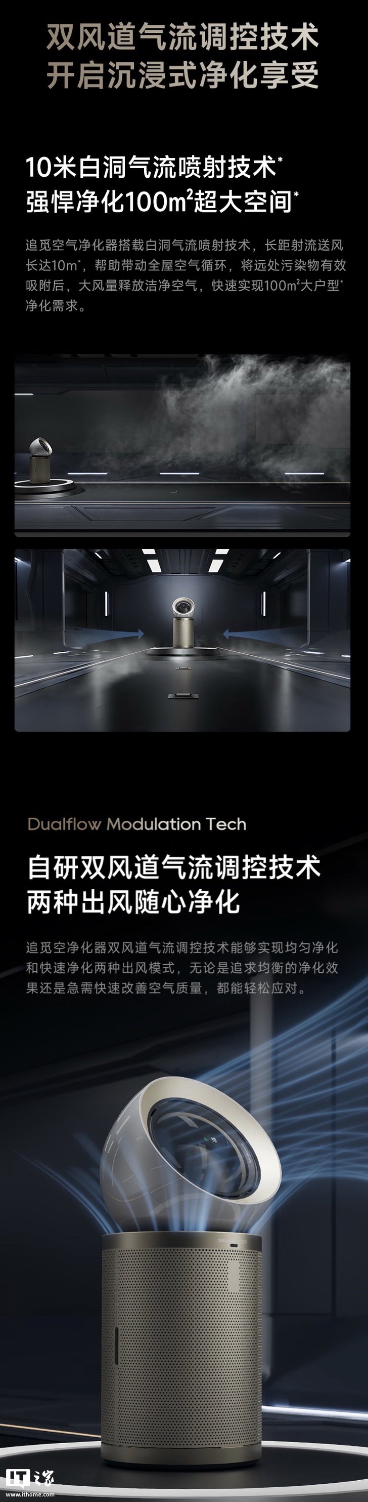 追觅表示,相应空气净化器搭载双风道气流调控技术,能实现射流模式均匀净化和大风量模式快速净化间切换,实现全屋空气循环,至高可满足 100㎡大户型净化需求。