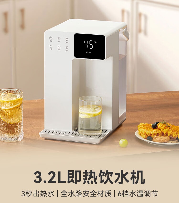 据介绍,这款饮水机为台式设计,配备 3.2L 大水箱,具备 6 档水温调节,支持 3 秒即热。